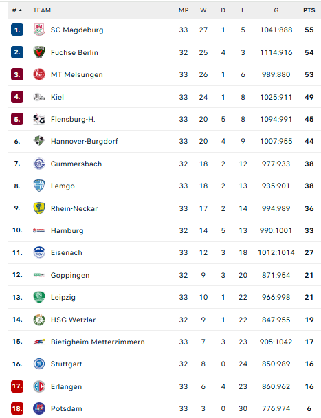 Iš kovos dėl čempiono vardo pasitraukė Melzungeno klubas. Tiesa, „Melsungen“ vis dar turi galimybę užimti antrąją vietą ir iškovoti antrąjį Vokietijai skirtą kelialapį į Čempionų lygą.