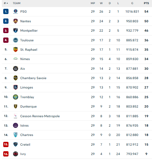 Pirmauja: PSG – 54, „Nantes“ – 50, „Montpellier“ – 46, „Toulouse“ – 36, „St.Raphael“ – 35, „Nîmes“ – 34.