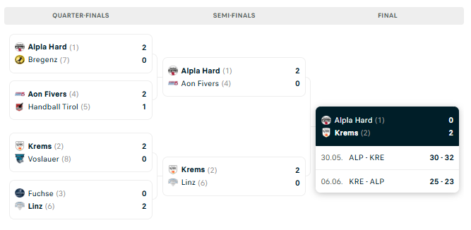 „Alpla“ pralaimėjo abejas finalo serijos rungtynes. Prieš savaitę namie Hardo rankininkai nusileido „Krems“ ekipai 30:32, o šį penktadienį tokiu pačiu dviejų įvarčių skirtumu pralaimėjo Kremse. K.Antanavičius per antrąsias finalo rungtynes įmetė 8 įvarčius ir buvo rezultatyviausias „Alpla“ žaidėjas.