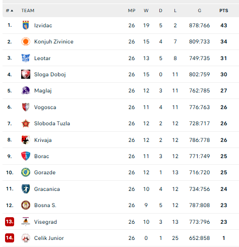 Bosnijos ir Hercegovinos lygos lentelė