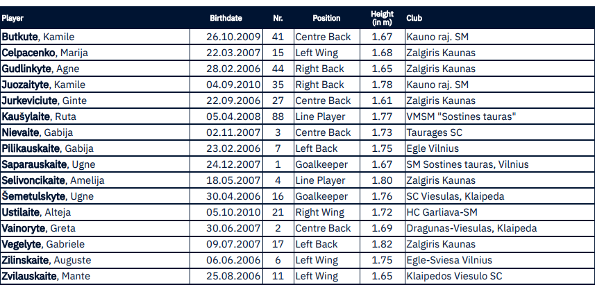 Vyresniojoje merginų rinktinėje žaidė kelios jaunesnės rankininkės, turinčios teisę rungtyniauti 17-mečių turnyre. Jauniausios 19-mečių ekipos žaidėjos buvo 2010 metais gimusios Altėja Ustilaitė ir Kamilė Juozaitytė.