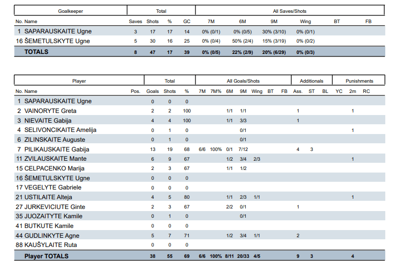 Agnė Gudlinkytė pelnė 33 įvarčius, Altėja Ustilaitė – 27, Mantė Žvilauskaitė – 20, Amelija Selivončikaitė – 18, Greta Vainorytė – 17.