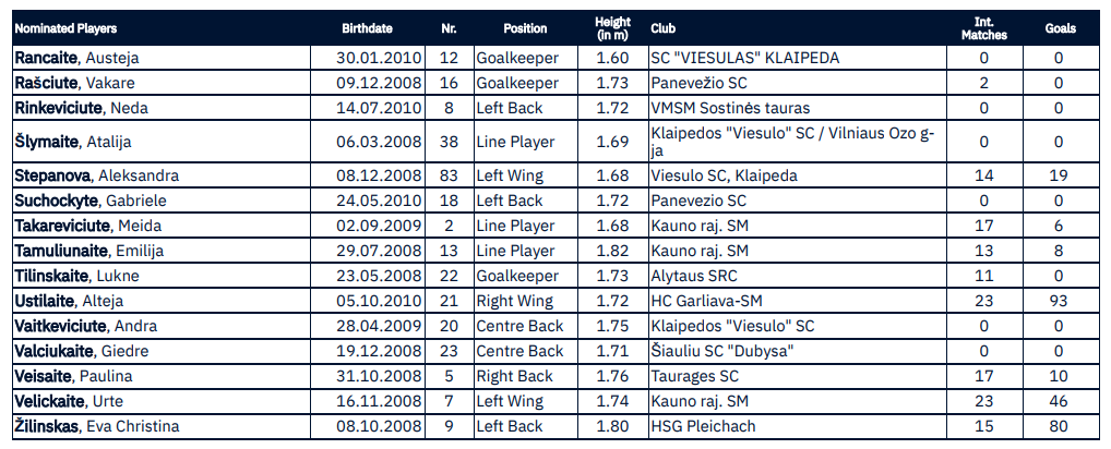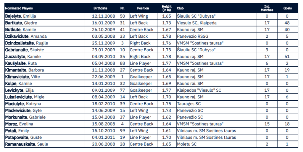 Vyresniojoje rinktinėje žaidė keturios rankininkės, gimusios 2008 metais ar vėliau ir turinčios teisę žaisti jaunesniojoje komandoje. Į Podgoricą antrą kartą išvyko Altėja Ustilaitė, Kamilė Juozaitytė, Kamilė Butkutė ir Rūta Kaušylaitė.