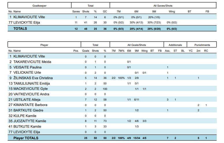 Lietuva – Juodkalnija 25:36 (10:18). Juozaitytė 8, A.Ustilaitė 6, Žilinskas 5, Mackevičiūtė 2, Bartkutė 2, Tamuliūnaitė 1, Butkutė 1 / Tesovič 7, Savič 7.