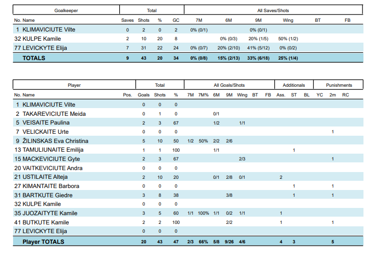 Lietuva – Čekija 20:34 (8:15). Žilinskas 5, Bartkutė 3, Juozaitytė 3, Veisaitė 2, Mackevičiūtė 2, Ustilaitė 2, Butkutė 2, Tamuliūnaitė 1 / Hanzlikova 7, Konigova 6.