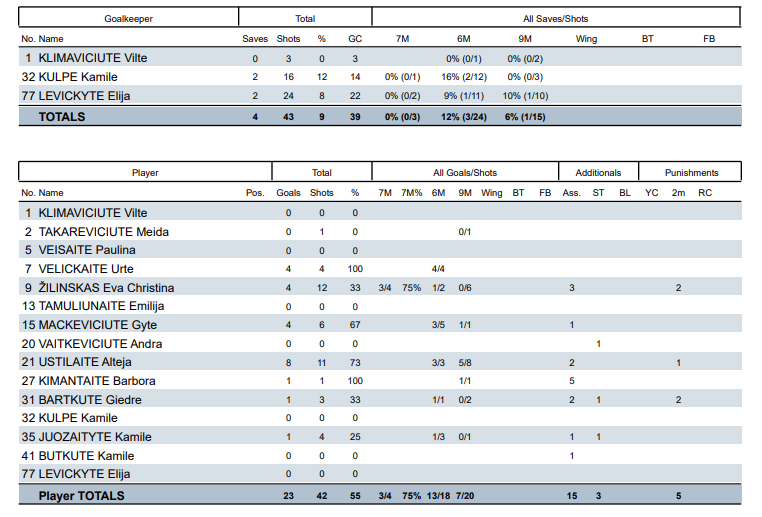 Lietuva – Prancūzija 23:39 (11:18). A.Ustilaitė 8, Veličkaitė 4, Žilinskas 4, Mackevičiūtė 4, Kimantaitė 1, Bartkutė 1, Juozaitytė 1 / Saramito 6, Noslen 5, Plancon 5.