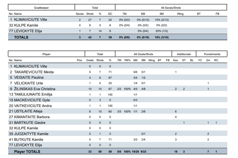 Lietuvos rinktinėje rezultatyviausiai žaidė Altėja Ustilaitė. Šiais metais Lietuvos čempione tapusi „Garliavos“ rankininkė, kuriai tik rudenį sukaks 15 metų, Europos pirmenybėse įmetė 56 įvarčius. Vokietijoje užaugusi Eva Žilinskas pelnė 44 įvarčius.
