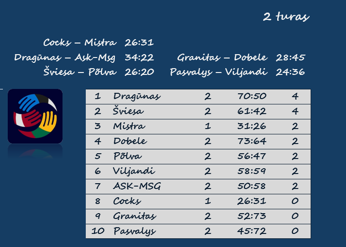 Kitom dviem Lietuvos komandoms namų sienos per du pirmuosius turus nepadėjo nė karto. Sekmadienį Kauno „Granitas“ nusileido Duobelės „Tenax“ rankininkams 28:45 (11:20), Baltijos lygos debiutantės Pasvalio „Pieno žvaigždės“ pralaimėjo „Viljandi“ komandai 24:36 (11:17).