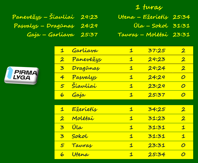 Lietuvos vyrų rankinio pirmosios lygos pirmajame ture taškus prarado abi stipriausios praėjusio sezono komandos. Pavasarį pirmosios lygos čempionais tapę, bet per vasarą susilpnėję „Šiauliai“ sekmadienį išvykoje pralaimėjo po sezono pertraukos į nacionalines varžybas grįžusiam „Panevėžiui“ 23:29 (12:16), o prieš kelis mėnesius sidabru džiaugęsis Šalčininkų-Eišiškių „Sokol“ varžovų salėje sužaidė lygiosiomis 31:31 (17:12) su Varėnos „Ūlos“ dubleriais.