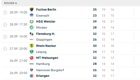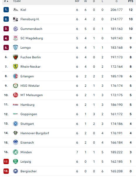 Pirmauja: „Kiel“ – 12, „Flensburg“, „Gummersbach“ – po 10, „Magdeburg“, „Lemgo“ – po 9, … „Stuttgart“ – 4, „Minden“ – 3, … „Bergische“ – 0.