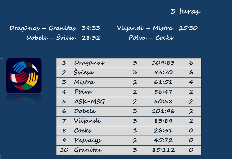 Sėkmingai Baltijos lygos varžybas pradėję Klaipėdos „Dragūnas“ ir Vilniaus „Šviesa“ šeštadienį pasiekė trečiąsias pergales. „Dragūnas“ dvigubos įskaitos rungtynėse, kurių rezultatas taip pat įtrauktas į Lietuvos lygos lentelę, namie nugalėjo Kauno „Granitą“ 39:33 (20:12), o „Šviesa“ išvykoje įveikė Latvijos vicečempioną Duobelės „Tenax“ 32:28 (15:13).
