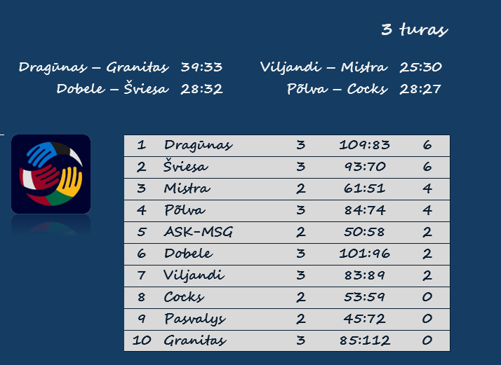 Anksčiau šeštadienį trečiąsias pergales pasiekė dvi Lietuvos komandos. Klaipėdos „Dragūnas“ dvigubos įskaitos rungtynėse, kurių rezultatas taip pat įtrauktas į Lietuvos lygos lentelę, namie nugalėjo Kauno „Granitą“ 39:33 (20:12), o Vilniaus „Šviesa“ išvykoje įveikė Latvijos vicečempioną Duobelės „Tenax“ 32:28 (15:13).
