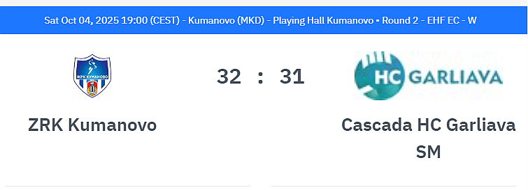 Garliavos rankininkės šeštadienį atsakomąsias rungtynes Kumanovo mieste pralaimėjo 31:32 (17:13). Tačiau jaudintis Šiaurės Makedonijoje nereikėjo, nes „Garliava“ prieš savaitę pirmąsias rungtynes laimėjo gerokai didesniu septynių įvarčių skirtumu 32:25, o varžovių arenoje taip pat ilgai pirmavo ir nesuteikė „Kumanovo“ ekipai jokios vilties pasiekti reikiamą rezultatą.