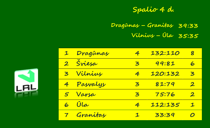 Kitą savaitgalį Lietuvos lygoje vyks dvejos rungtynės. Šeštadienį (spalio 11 d.) „Ūla“ priims Alytaus „Varsą“, „Vilnius“ – „Granitą“.