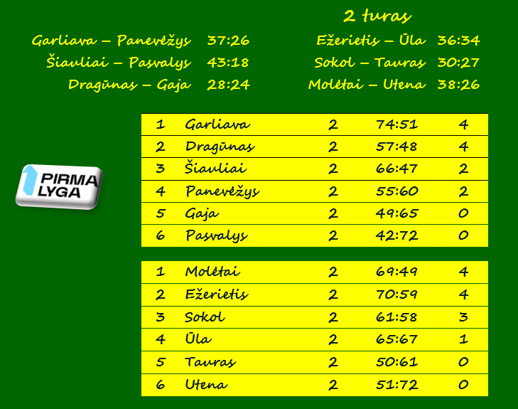 Lietuvos vyrų rankinio pirmojoje lygoje sekmadienį buvo žaidžiamos antrojo turo rungtynės. Antrąsias pergales pasiekė keturios komandos: A grupėje – „Garliava“ ir Klaipėdos „Dragūno“ dubleriai, B grupėje – „Molėtai“ ir Zarasų „Ežerietis“.
