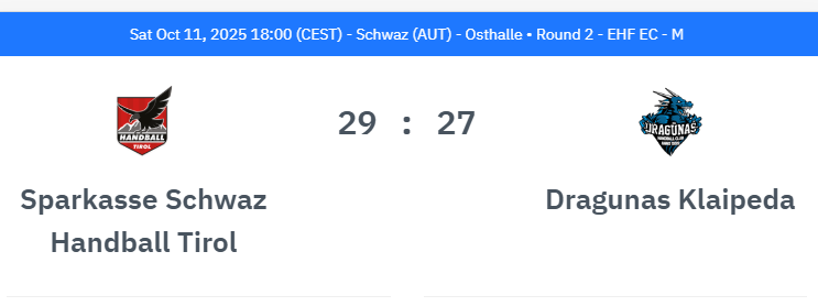 Švaco „Tirol“ – Klaipėdos „Dragūnas“ 29:27 (13:14).