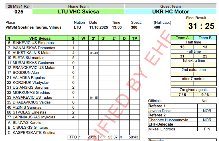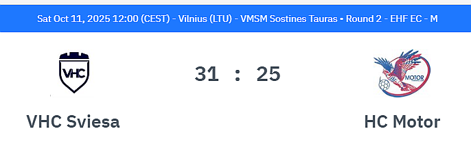 „Šviesa“ šeštadienį Vilniuje žaidė su Ukrainos čempionu Zaporižės „Motor“ klubu ir pasiekė pergalę 31:25 (13:13). Kova dėl kelialapio į trečiojo pagal rangą Europos turnyro trečiąjį etapą bus pratęsta kitą šeštadienį (spalio 18 d.) Slovakijos mieste Michalovcuose. Ten vyks atsakomosios rungtynės.