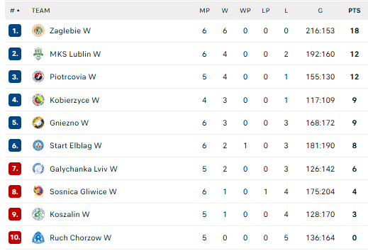 Pirmauja: „Zaglębie“ – 18, „Lublin“, „Piotrcovia“ – po 12, „Kobierzyce“, „Gniezno“ – po 9, … „Sośnica“ – 4.