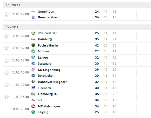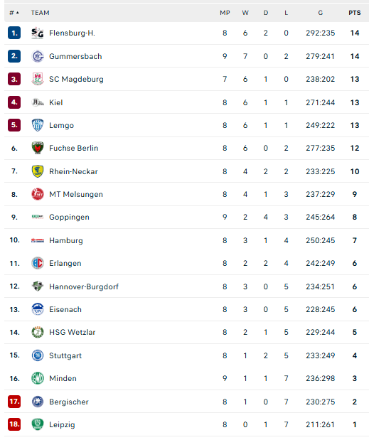 Pirmauja: „Flensburg“, „Gummersbach“ – po 14, „Magdeburg“, „Kiel“, „Lemgo“ – po 13, „Füchse“ – 12, … „Stuttgart“ – 4, „Minden“ – 3, „Bergische“ – 2.