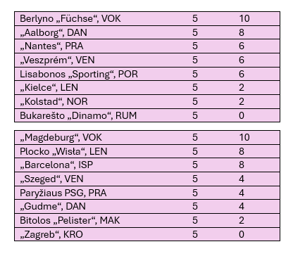 Po penkių turų abiejose grupėse pirmauja Vokietijos klubai. Po 10 taškų iškovojo visas rungtynes laimėję „Füchse“ ir „Magdeburg“.