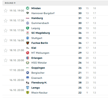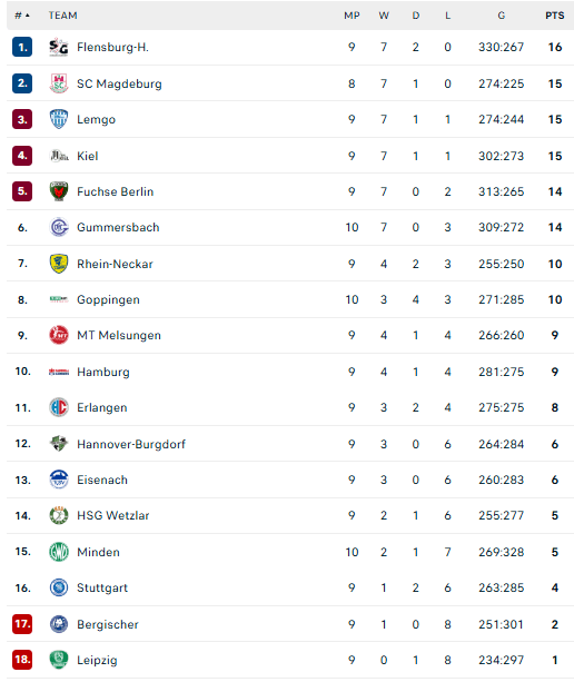 Pirmauja: „Flensburg“ – 16, „Magdeburg“, „Lemgo“, „Kiel“ – po 15, „Füchse“, „Gummersbach“ – po 14, … „Minden“ – 5, „Stuttgart“ – 4, „Bergische“ – 2.