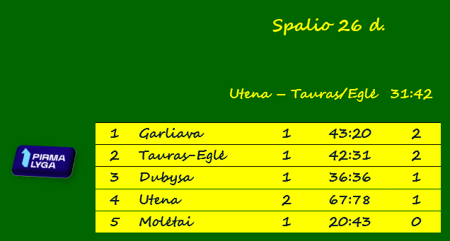 „Utena“ – Vilniaus „Tauras-Eglė“ 31:42 (18:19). Ilčiukaitė 11, Dūdėnaitė 6 / Raudonikytė 7, Katiliavaitė 6, Mačiulytė 5, Žilinskaitė 5.