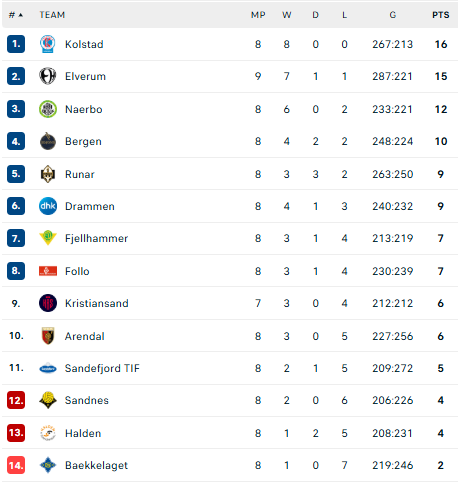 Pirmauja: „Kolstad“ – 16, „Elverum“ – 15, „Nærbø“ – 12, „Bergen“ – 10, „Runar“ – 9, … „Kristiansand“ – 6.