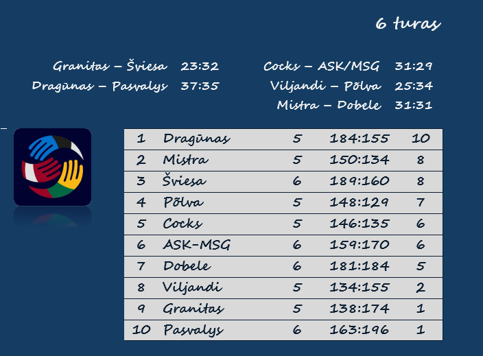 „Viljandi“ – Pylvos „Serviti“ 25:34 (12:18). Koksas 10, Varikas 4 / Rebane 8, Saksingas 5.