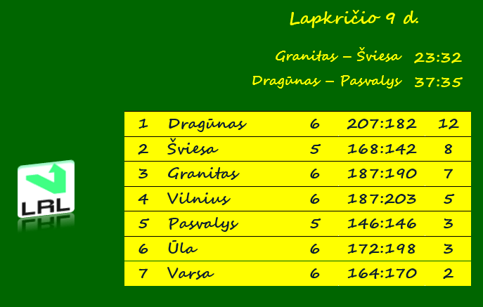 Lietuvos lygoje „Dragūnas“ per 6 rungtynes iškovojo 12 taškų. Į antrąją vietą pakilo 8 taškus turinti „Šviesa“. Vilniaus komanda lentelėje aplenkė sekmadienį įveiktą „Granitą“, kurio sąskaitoje liko 7 taškai.
