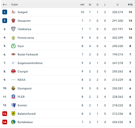 Lentelės viršuje lieka „Szeged“, bet šis klubas žaidė trejomis rungtynėmis daugiau nei artimiausi persekiotojai ir šį rudenį jau prarado tris taškus. Tuo tarpu „Veszprém“ ir „Tatabanya“ nesėkmių dar nepatyrė.