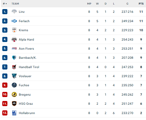 Pirmauja: „Linz“, „Ferlach“ – po 11, „Krems“ – 10, „Alpla“, „Fivers“, „Barnbach“ – po 9, … „Bregenz“ – 7.