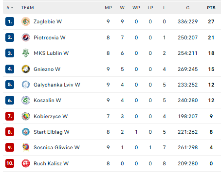 Pirmauja: „Zaglębie“ – 27, „Piotrcovia“ – 21, „Lublin“ – 18, … „Kobierzyce“ – 9, … „Sośnica“ – 4.