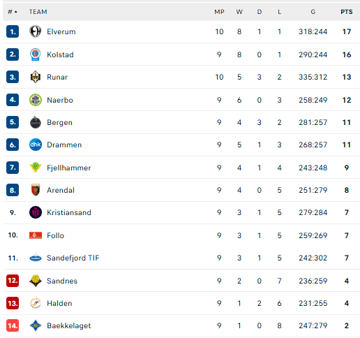 Pirmauja: „Elverum“ – 17, „Kolstad“ – 16, „Runar“ – 13, „Nærbø“ – 12, … „Kristiansand“ – 7.