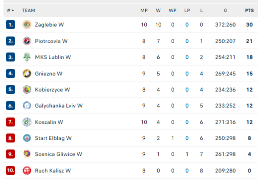 Pirmauja: „Zaglębie“ – 30, „Piotrcovia“ – 21, „Lublin“ – 18, „Gniezno“ – 15, „Kobierzyce“ – 12, … „Sośnica“ – 4.