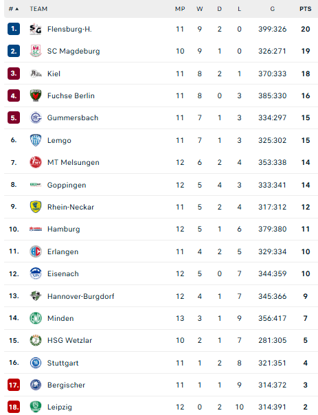 Pirmauja: „Flensburg“ – 20, „Magdeburg“ – 19, „Kiel“ – 18, „Füchse“ – 16, … „Minden“ – 7, … „Stuttgart“ – 4, „Bergische“ – 3.