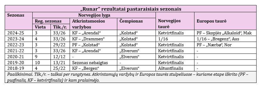 Norvegijos lygoje „Runar“ šiuo metu užima trečiąją vietą. Sandefjordo komanda per 10 rungtynių surinko 13 taškų ir jau gana žymiai atsilieka nuo favoritų „Elverum“ (17) ir „Kolstad“ (16), o kelis artimiausius persekiotojus lenkia tik vienu arba dviem taškais. Be to, trys ant kulnų lipančios komandos žaidė mažiau rungtynių, tad pagal prarastus taškus „Runar“ neįgijo jokio pranašumo.