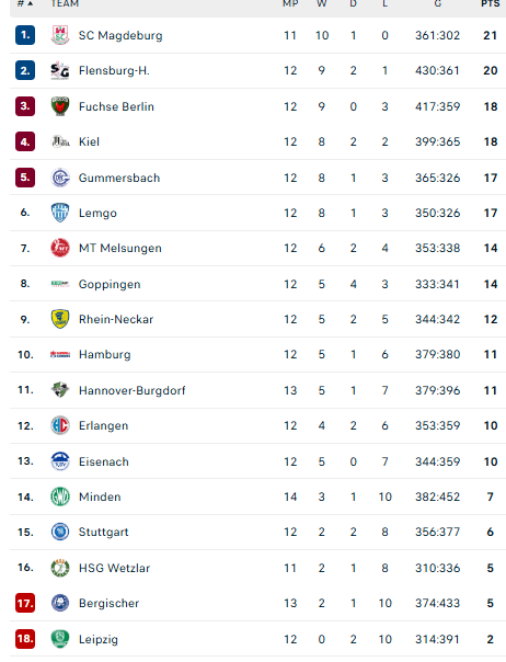 Pirmauja: „Magdeburg“ – 21, „Flensburg“ – 20, „Füchse“ – 18, „Kiel“ – 18, „Gummersbach“ – 17, „Lemgo“ – 17, … „Minden“ – 7, „Stuttgart“ – 6, „Bergische“ – 5.