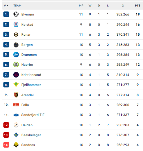 Lygos lyderiai yra „Elverum“ (19 taškų per 11 rungt.) ir čempiono vardą ginantis „Kolstad“ (16 taškų per 9 rungt.).