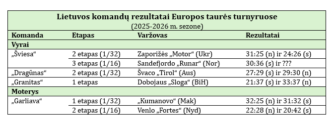 Kitos Lietuvos komandos šį rudenį iš Europos taurės turnyrų jau iškrito. Vyrų Europos taurės pirmajame etape Kauno „Granitas“ nusileido Dobojaus „Sloga“ komandai iš Bosnijos ir Hercegovinos, pirmajame etape nežaidęs Lietuvos čempionas Klaipėdos „Dragūnas“ antrajame etape pripažino Švaco „Tirol“ iš Austrijos pranašumą.
