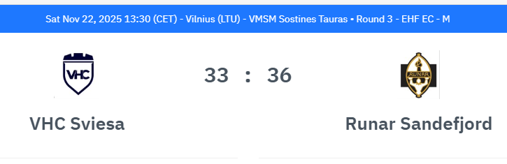 Vilniaus „Šviesos“ rankininkai šeštadienį atsakomosiose Europos taurės trečiojo etapo rungtynėse namie nusileido Sandefjordo „Runar“ komandai 33:36 (17:19). Vilniaus ekipoje rezultatyviausiai žaidė 7 įvarčius įmetęs Eimantas Sinkevičius. Matas Aukštikalnis ir Alanas Bogdiunas pelnė po 5 įvarčius.