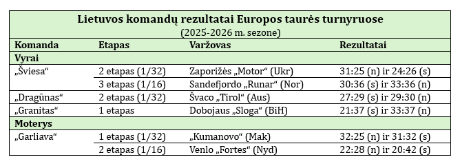 Vyrų Europos taurės pirmajame etape Kauno „Granitas“ nusileido Dobojaus „Sloga“ komandai iš Bosnijos ir Hercegovinos, pirmajame etape nežaidęs Lietuvos čempionas Klaipėdos „Dragūnas“ antrajame etape pripažino Švaco „Tirol“ iš Austrijos pranašumą.