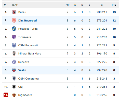 Pirmauja: „Buzău“ – 13, „Dinamo“ – 12, „Potaissa“, „Politehnica“ – po 10, … „Vaslui“ – 8.