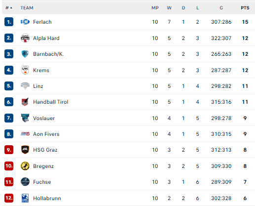Pirmauja: „Ferlach“ – 15, „Alpla“, „Barnbach“, „Krems“ – po 12, „Linz“, „Tirol“ – po 11, „Vöslau“ – 9, … „Bregenz“ – 8.