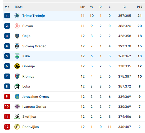 Pirmauja: „Trimo“ – 21, „Slovan“ – 20, „Celje“ – 18, „Slovenj Gradec“ – 15, „Krka“ – 13, „Gorenje“ – 12.