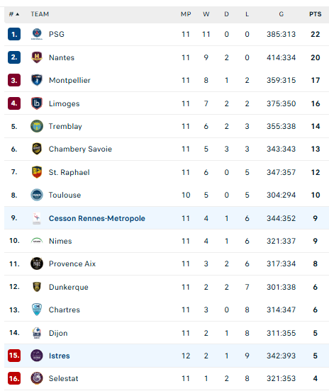 Pirmauja: PSG – 22, „Nantes“ – 20, „Montpellier“ – 17, „Limoges“ – 16, … „Istres“ – 5.