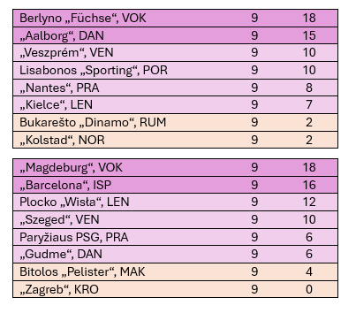 „Füchse“ po šio turo turi 18 taškų, „Aalborg“ – 15 taškų, o trečiąją vietą besidalijančios „Veszprém“ ir Lisabonos „Sporting“ ekipos surinko po 10 taškų, tad dviejų pirmųjų vietų likimas jau beveik aiškus.