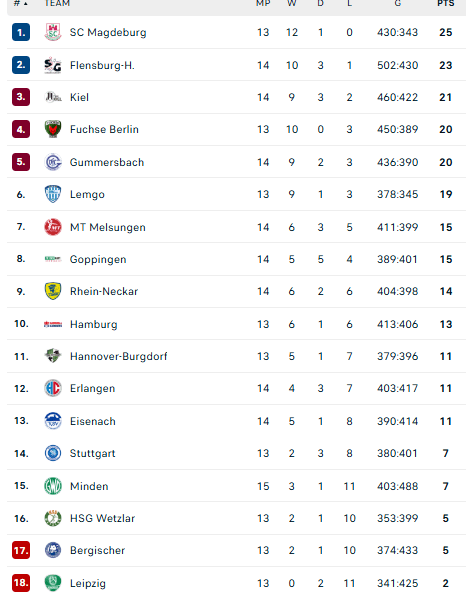 Pirmauja: „Magdeburg“ – 25, „Flensburg“ – 23, „Kiel“ – 21, „Füchse“, „Gummersbach“ – po 20, … „Stuttgart“, „Minden“ – po 7, „Bergische“ – 5.