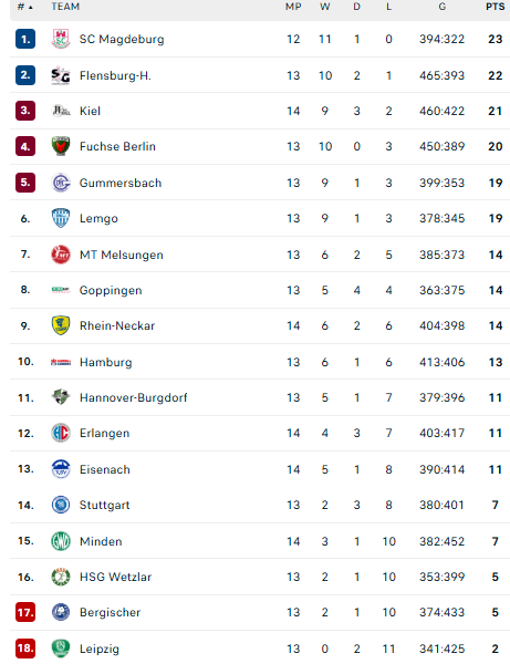 Pirmauja: „Magdeburg“ – 23, „Flensburg“ – 22, „Kiel“ – 21, „Füchse“ – 20, „Gummersbach“, „Lemgo“ – po 19, … „Stuttgart“, „Minden“ – po 7, … „Bergische“ – 5.