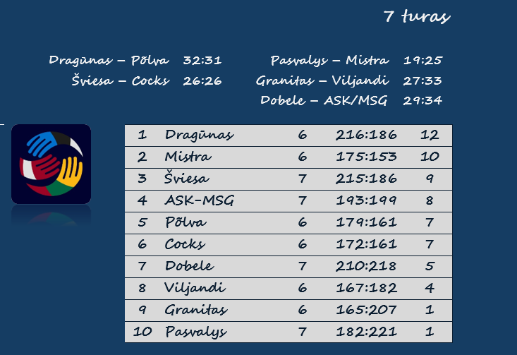 Tuo tarpu šį sezoną dar nė karto nelaimėję Kauno „Granitas“ ir Pasvalio „Pieno žvaigždės“ nieko nepešė ir šiame ture. „Granitas“ pralaimėjo „Viljandi“ komandai 27:33 (13:16), „Pieno žvaigždės“ – Rasiku „Mistra“ ekipai 19:25 (9:16).