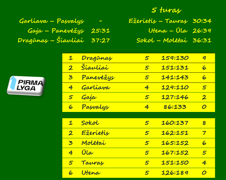 Per penkis turus 8 taškus iškovojęs „Sokol“ pakilo į pirmąją vietą. 7 taškus turi „Ežerietis“, 6 – „Molėtai“.